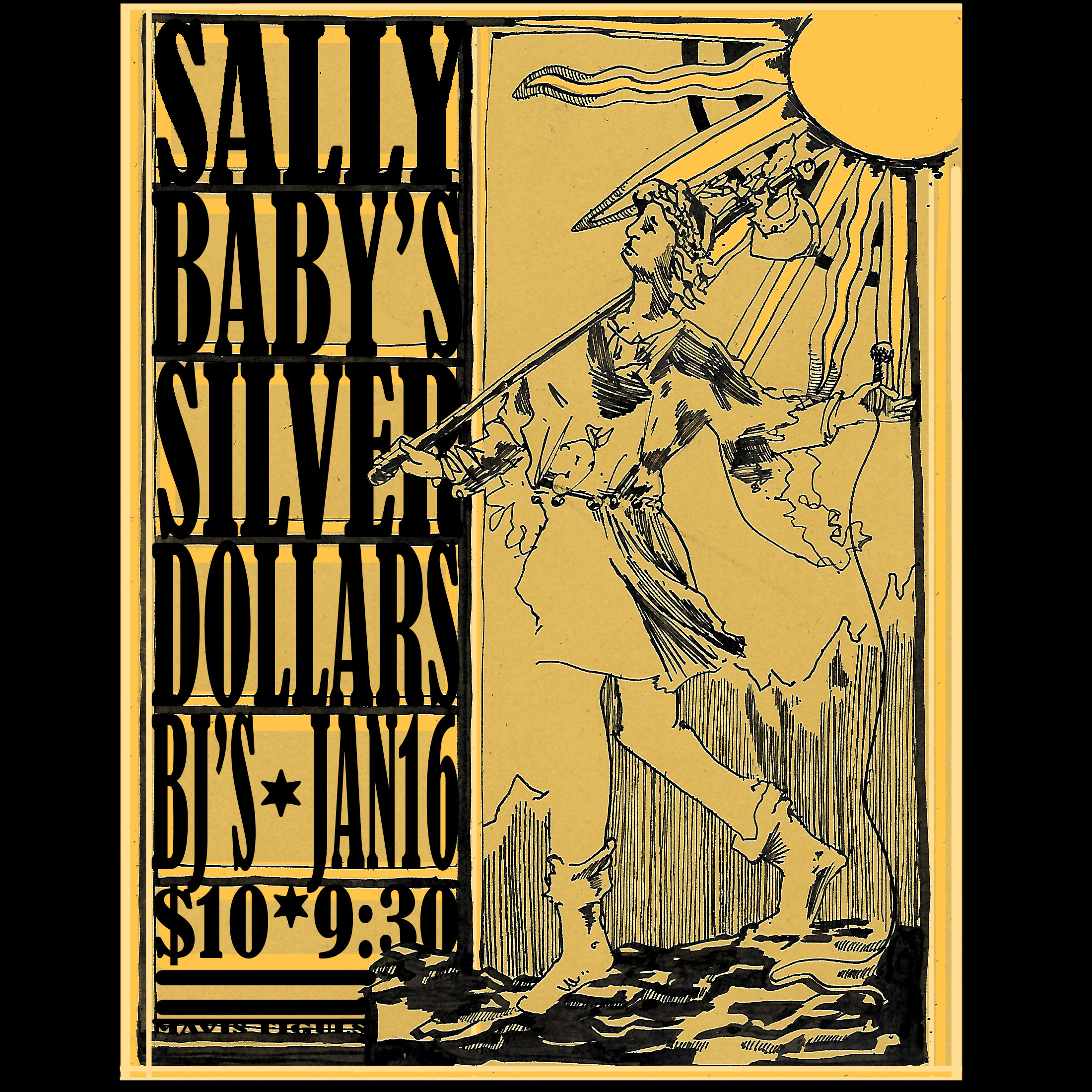 Poster for Sally Baby, Coleman Akin, Sullivan's Saddle Bag Serenaders, April 2024, Pen and ink and digital